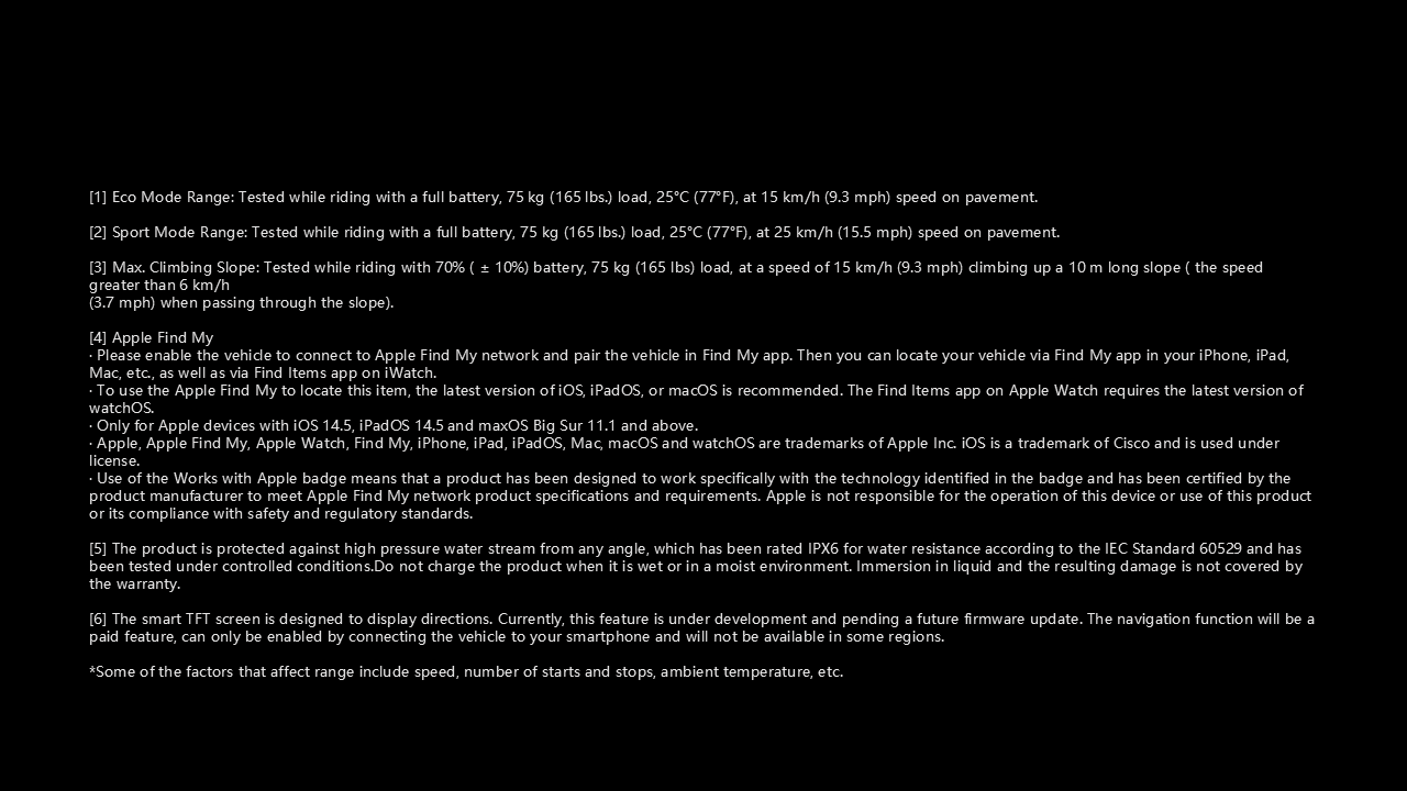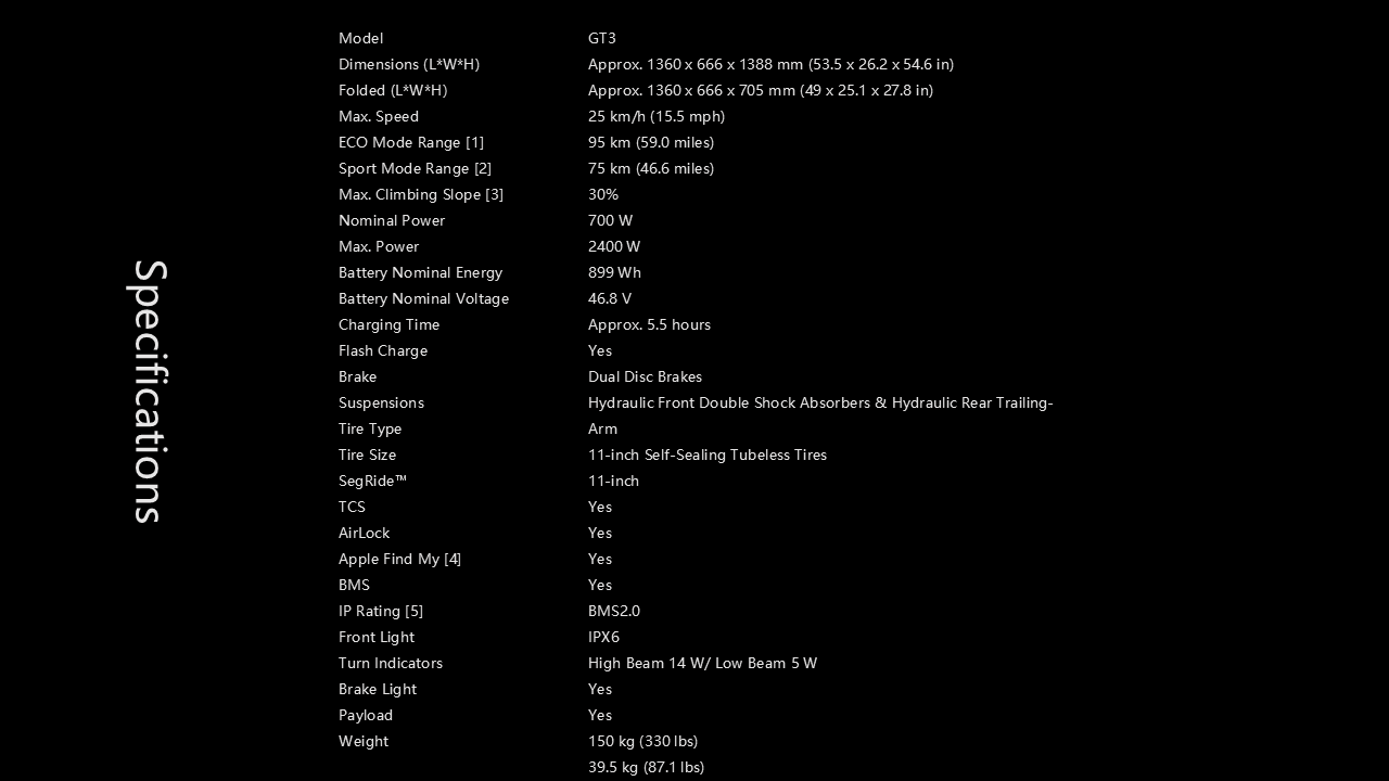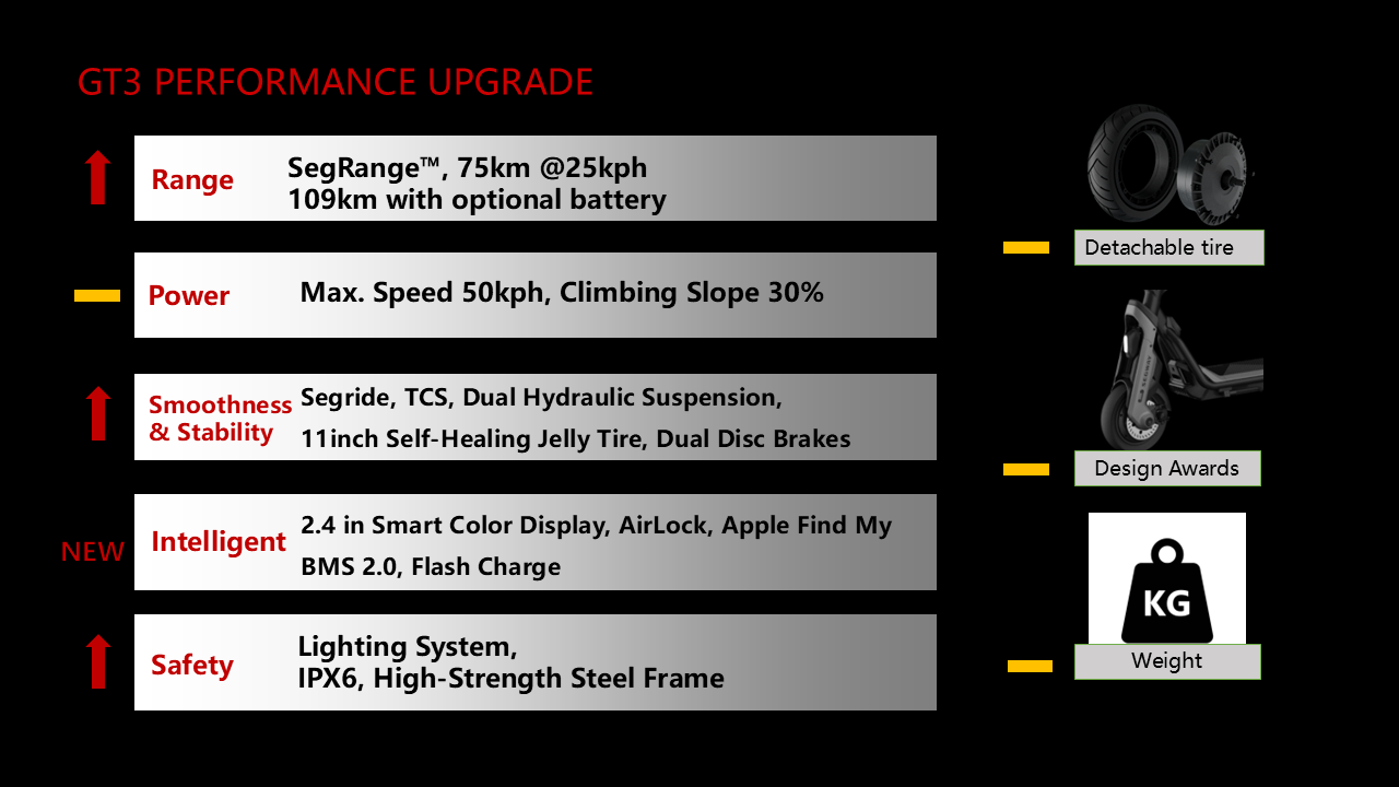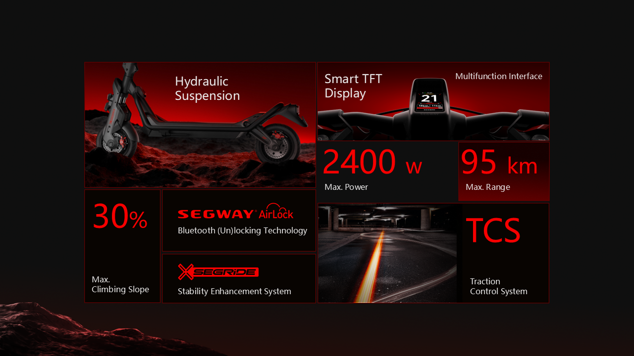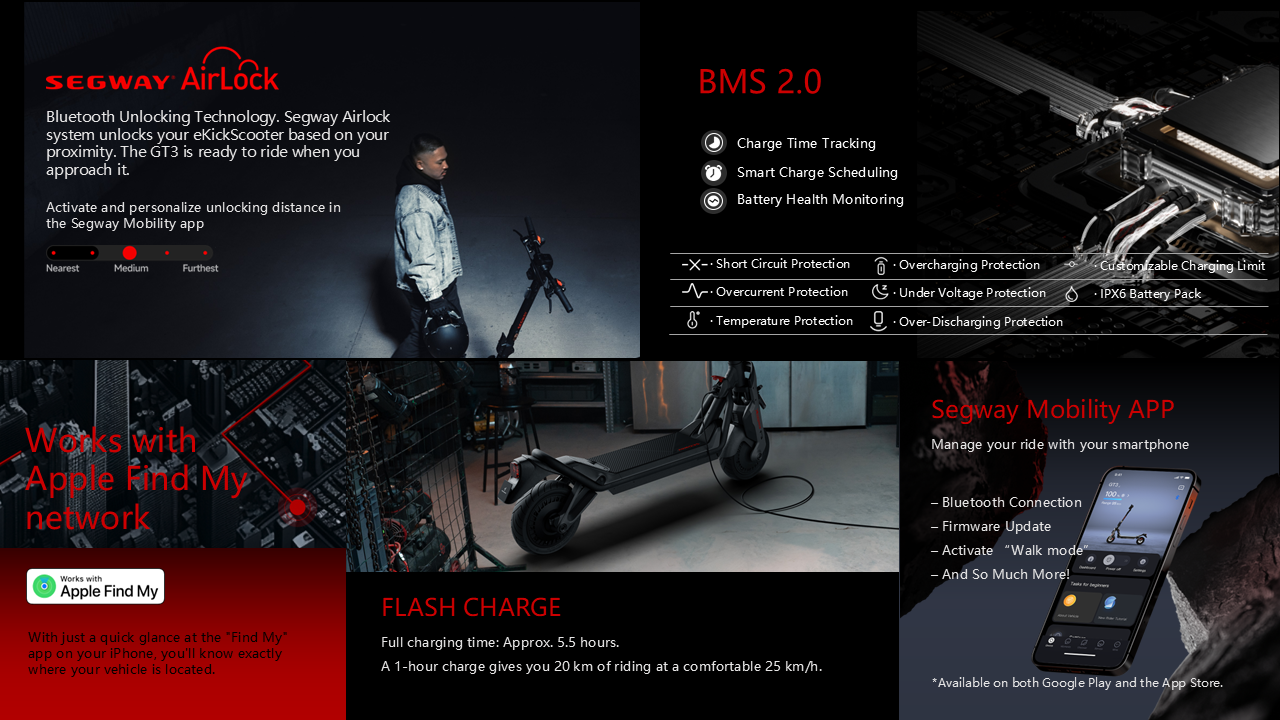 • Connectivity & Assistance: Segride, Riding Assistance, Segway Airlock, Find My App